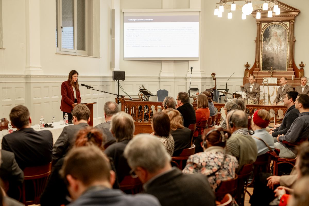 Erika Hosselkus, az egyetem könyvtárának helyettes dékánja az alapító, a legendás Theodore M. Hesburgh atya (1917–2015) szavait idézte a hallgatóságnak – „A könyvtár legyen az a hely, ahol lankadatlan az igazság iránti vágy, ahonnan világszerte támogatásra lel a szabadság és az igazságosság, ahol bátorítják a kiválóságot, és amely mindig nagyobb álmokra ösztönöz” –, majd bemutatta a fenti gondolatok alapján működő tekintélyes intézményt, feldolgozási gyakorlatát és nemzetközi jelentőségét.